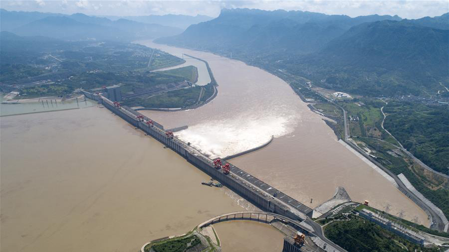 這是7月14日在湖北省宜昌市秭歸縣茅坪鎮(zhèn)拍攝的江水通過三峽大壩泄洪深孔下泄的場景(無人機(jī)航拍)。7月13日,長江委水文局發(fā)布汛情,長江2018年第2號洪水已在長江上游形成,三峽水庫將迎來今年以來最大洪峰。