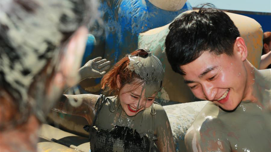 7月14日,游客在韓國保寧市舉行的保寧泥漿節(jié)上體驗(yàn)?zāi)酀{摔跤。保寧泥漿節(jié)是韓國每年夏季的知名活動(dòng),游客可以在此期間參與各種使用泥漿的趣味游戲。新華社記者 王婧嬙 攝  7月14日,一名游客在韓國保寧市舉行的保寧泥漿節(jié)上體驗(yàn)?zāi)酀{池滑梯。