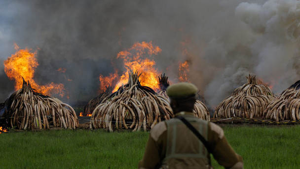 2016年4月30日,肯尼亞總統胡魯·肯雅塔在肯尼亞內羅畢國家公園內親手點燃了收繳的105噸象牙和1.35噸犀牛角.