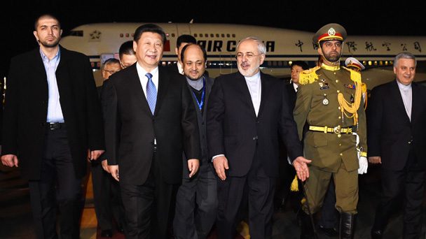 1月22日,國家主席習近平乘專機抵達伊朗首都德黑蘭,開始對伊朗進行國事訪問。這是在梅赫拉巴德機場,習近平受到伊朗外交部長扎里夫等熱情迎接。新華社記者饒愛民攝