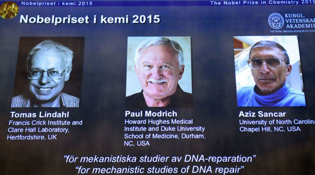 據(jù)諾貝爾獎官網(wǎng)的最新消息,瑞典斯德哥爾摩當(dāng)?shù)貢r(shí)間7日中午11時(shí)45分,2015年諾貝爾化學(xué)獎在當(dāng)?shù)氐娜鸬浠始铱茖W(xué)學(xué)院揭曉,托馬斯?林道爾、保羅?莫德里奇以及阿奇茲?桑卡獲獎。獲獎理由是“DNA修復(fù)的細(xì)胞機(jī)制研究”。