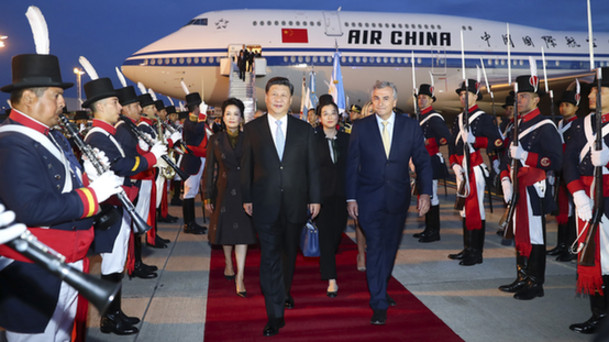 儀仗隊長趨前致敬,軍樂團奏響雄勁有力的進行曲,習(xí)近平和彭麗媛沿紅地毯前行,禮兵分列紅地毯兩側(cè),行注目禮。習(xí)近平指出,阿根廷是首個舉辦二十國集團領(lǐng)導(dǎo)人峰會的南美國家,今年又恰逢峰會啟動10周年,具有重要意義。