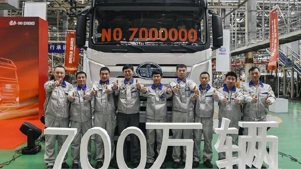 當(dāng)日,一輛白色解放J7緩緩駛下一汽解放卡車廠總裝車間生產(chǎn)線,這標(biāo)志著我國自主研發(fā)的第700萬輛解放卡車在長春正式下線。 新華社記者 許暢 攝  11月30日,媒體記者在拍攝展出的第一代解放CA10型卡車(左)和解放J7卡車(右)。