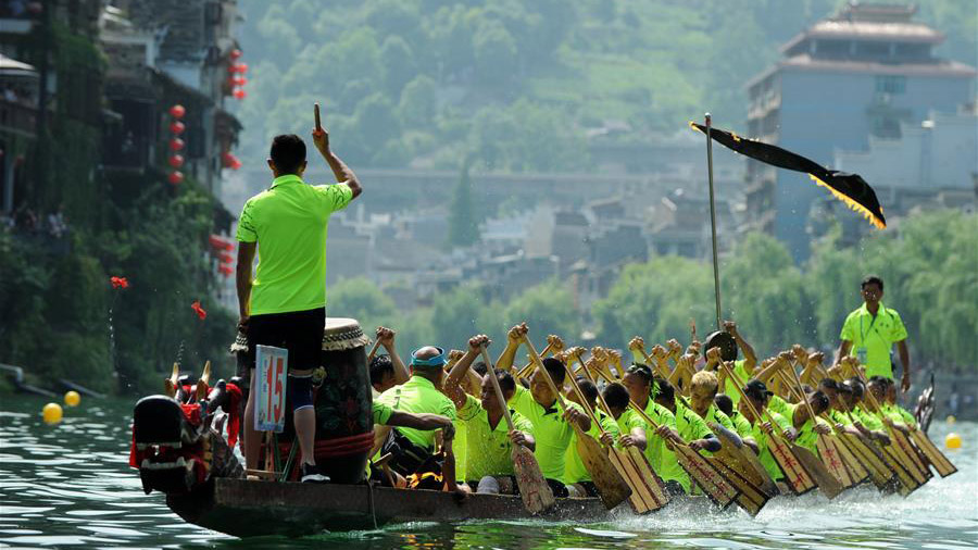 6月18日,在貴州省黔東南苗族侗族自治州鎮遠縣 陽河上,當地群眾在傳統龍舟賽上賽龍舟。新華社發(楊文斌 攝)  6月18日,在貴州省黔東南苗族侗族自治州鎮遠縣 陽河上,當地群眾在傳統龍舟賽上賽龍舟。