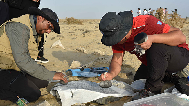 4月5日,中沙考古隊員在沙特阿拉伯塞林港遺址展開工作。新華社記者王波攝  4月5日,在沙特阿拉伯塞林港遺址,中沙聯合考古隊的中方領隊姜波(中)展示考古發現的阿拉伯釉陶。新華社記者王波攝  4月5日,在沙特阿拉伯塞林港遺址,考古隊員展示發現的中國青花瓷片。