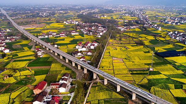 3月21日,一列動(dòng)車正通過陜西省漢中市南鄭縣新集鎮(zhèn)油菜花海(無(wú)人機(jī)拍攝)。新華社記者 胡虎虎 攝  3月24日,河北省靈壽縣南營(yíng)鄉(xiāng)車谷砣村黨支部書記陳春芳介紹他帶領(lǐng)村民開辦農(nóng)家樂脫貧的情況。