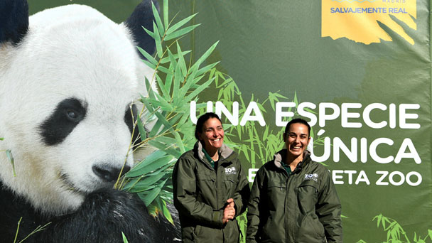 3月22日,在西班牙馬德里動物園,飼養員瑞貝卡(右)和艾斯特法妮雅站在大熊貓宣傳畫前。新華社記者郭求達攝  3月22日,在西班牙馬德里動物園,飼養員瑞貝卡(左)和艾斯特法妮雅站在遠處觀看大熊貓“冰星”活動。