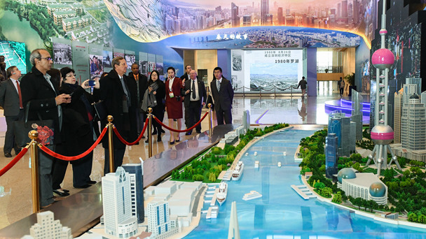 當(dāng)日,在國(guó)家博物館舉行的“偉大的變革——慶祝改革開放40周年大型展覽”迎來外賓專場(chǎng)。新華社記者李賀攝 11月19日,外賓在展覽上參觀中國(guó)自行設(shè)計(jì)制造的航天服。