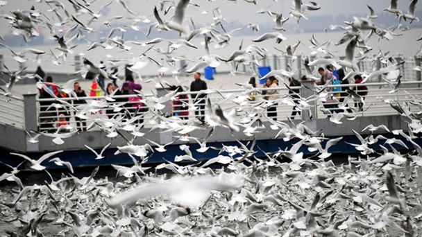 2月4日,人們穿著厚厚的冬裝在昆明滇池邊給紅嘴鷗喂食。天氣雖然寒冷,卻抵擋不住市民和游客前來滇池觀賞、喂食越冬紅嘴鷗的熱情。