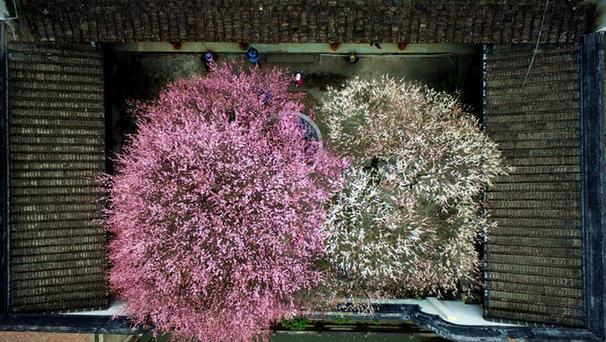 1月25日,位于福州北峰山區的千年古剎林陽寺梅花盛開,吸引許多游客前來賞花游玩。林陽寺是福州五大禪寺之一,相傳建于唐朝,距今已有千年歷史。圖為空中鳥瞰已有200多年歷史的紅白兩株梅花。