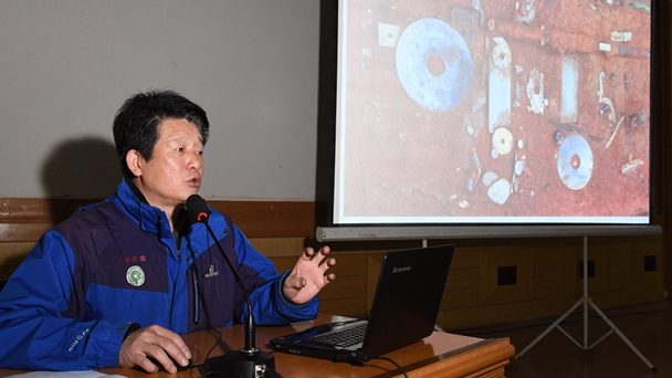 1月26日,海昏侯墓葬文物保護及技術保障負責人、中國社科院考古研究所副研究員李存信在江西考古匯報會上介紹海昏侯墓園五號墓的發掘情況。