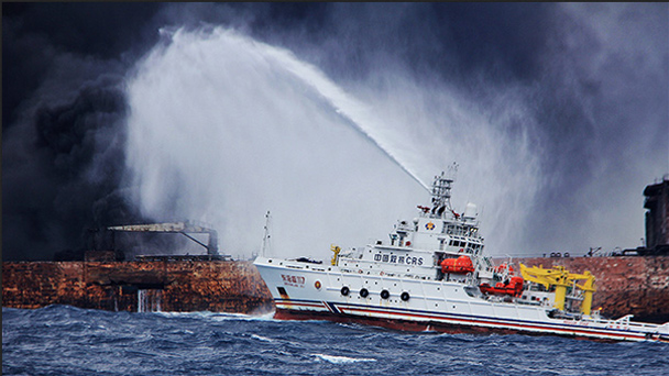 1月12日,上海海事局的救援船只在向“桑吉”輪噴射泡沫降溫滅火。中國救援人員正冒著巨大的生命危險和安全威脅不斷接近事故船只,全力做好人員搜救、消防滅火、污染防控工作。新華社發  1月12日,上海海事局的救援船只在向“桑吉”輪噴射泡沫降溫滅火。