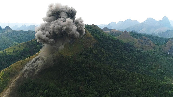 掃雷官兵手拉手走過完成清理的中越邊境廣西段某雷場(12月22日攝)。新華社記者 周華 攝  掃雷隊在中越邊境廣西段某雷場引爆炸藥,以清除雷場植被,方便后期搜排(12月22日攝)。新華社記者 周華 攝  在中越邊境廣西段某雷場,掃雷官兵進(jìn)入爆破作業(yè)后的區(qū)域進(jìn)行搜排(12月22日攝)。