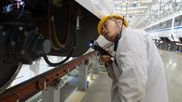 周二,西安動車段的工程師們對CRH3A動車組進行了最后檢修,為明天西成高鐵的開通做準備。該型號動車組新增坡起制動功能,可滿足西成高鐵長大坡道上靜止和啟動不溜坡的要求。西成高鐵是穿越秦嶺的首條高鐵。其中長達45公里的大坡道是目前國內最長的高鐵連續長大坡道。