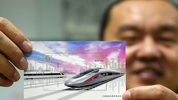 11月25日,中國(guó)郵政集團(tuán)公司河北省新樂市分公司工作人員展示《中國(guó)高速鐵路發(fā)展成就》紀(jì)念郵票。新華社發(fā) 賈敏杰 攝 11月25日,中國(guó)郵政集團(tuán)公司河北省邯鄲市分公司工作人員展示《中國(guó)高速鐵路發(fā)展成就》紀(jì)念郵票小型張。