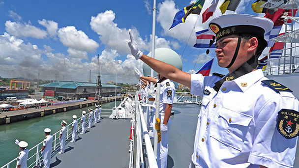 11月26日,在坦桑尼亞達(dá)累斯薩拉姆港,中國(guó)海軍和平方舟醫(yī)院船官兵向前來送行的人們揮手告別。