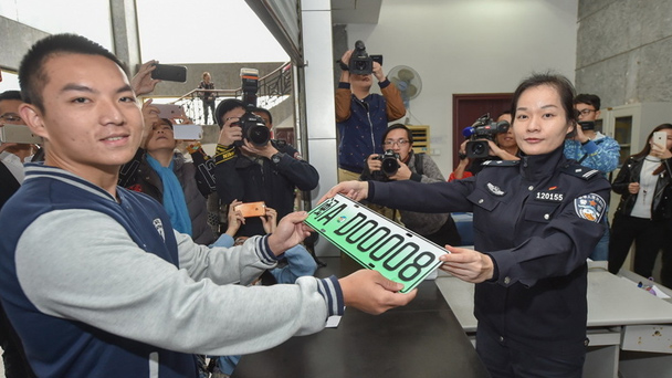 11月20日,在福州市交警支隊(duì)車輛管理所,民警向市民林先生發(fā)放當(dāng)?shù)氐谝粡埿履茉雌噷S锰柵啤?1月20日,在福州市交警支隊(duì)車輛管理所,工作人員在現(xiàn)場制作第一批新能源汽車專用號牌。