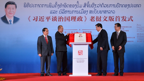 11月9日,在老撾首都萬象,中國國務院新聞辦公室副主任郭衛(wèi)民、老撾人民革命黨中央書記處書記、中宣部長吉喬等出席《習近平談治國理政》老撾文版首發(fā)式。