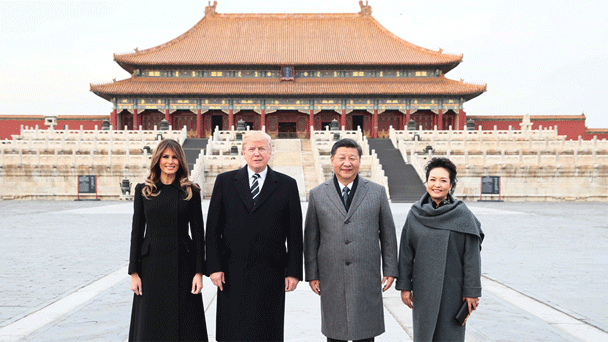 11月8日,國家主席習近平和夫人彭麗媛陪同來華進行國事訪問的美國總統(tǒng)特朗普和夫人梅拉尼婭參觀故宮博物院。