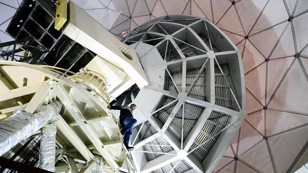10月27日,中國科學(xué)院紫金山天文臺青海觀測站助理工程師張永興在檢查13.7米毫米波射電望遠(yuǎn)鏡設(shè)備運(yùn)行狀況。