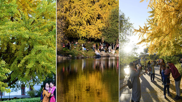 10月29日,人們在北京大學(xué)未名湖畔的一棵銀杏樹下拍照。深秋的北京大學(xué)在色彩斑斕的樹葉妝點(diǎn)下格外美麗。