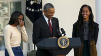 美國(guó)總統(tǒng)奧巴馬11月25日照往例在感恩節(jié)前夕赦免了火雞“亞伯”。他還講了雙關(guān)語(yǔ)笑話,感慨任期將至火雞不飛、但時(shí)光飛逝,把兩個(gè)女兒和在場(chǎng)賓客逗得大笑。