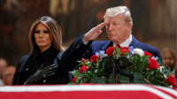 美國總統(tǒng)特朗普和夫人梅拉尼婭雖然沒有出席追悼儀式,但也在3日晚上前往國會悼念。他們在老布什的靈柩前駐足,并靜默片刻以表追思。他還舉手敬禮,向這位前總統(tǒng)致敬。