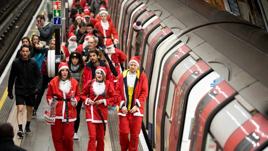 倫敦圣誕老人慈善跑活動 男女老少圣誕裝穿越地鐵