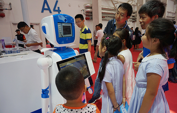2017世界機(jī)器人大會(huì)于23日—27日在北京亦創(chuàng)國際會(huì)展中心舉行。大會(huì)吸引了眾多家長及孩子參觀。置身機(jī)器人世界,小觀眾們投去好奇的眼光,他們不僅看的認(rèn)真,更積極地與機(jī)器人進(jìn)行互動(dòng)。
