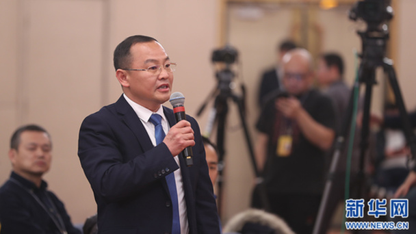 十三屆全國人大一次會議新聞中心于3月7日在梅地亞中心多功能廳舉行記者會,邀請扶貧辦主任劉永富就“打好精準(zhǔn)脫貧攻堅戰(zhàn)”的相關(guān)問題回答中外記者的提問。圖為劉永富回答記者提問。