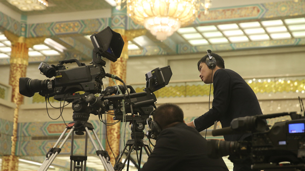 3月20日上午,十三屆全國人大一次會議閉幕后,國務院總理李克強在人民大會堂三樓金色大廳會見采訪十三屆全國人大一次會議的中外記者并回答記者提出的問題。圖為記者在現場拍攝。